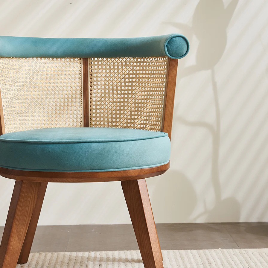 This chair combines natural texture with airy elegance, thanks to its handwoven natural rattan and robust wood construction. For informal get-togethers or daily meals, the luxurious turquoise cushion offers a vivid splash of color and all-day comfort, creating the ideal balance of flair and practicality.Details of the product
